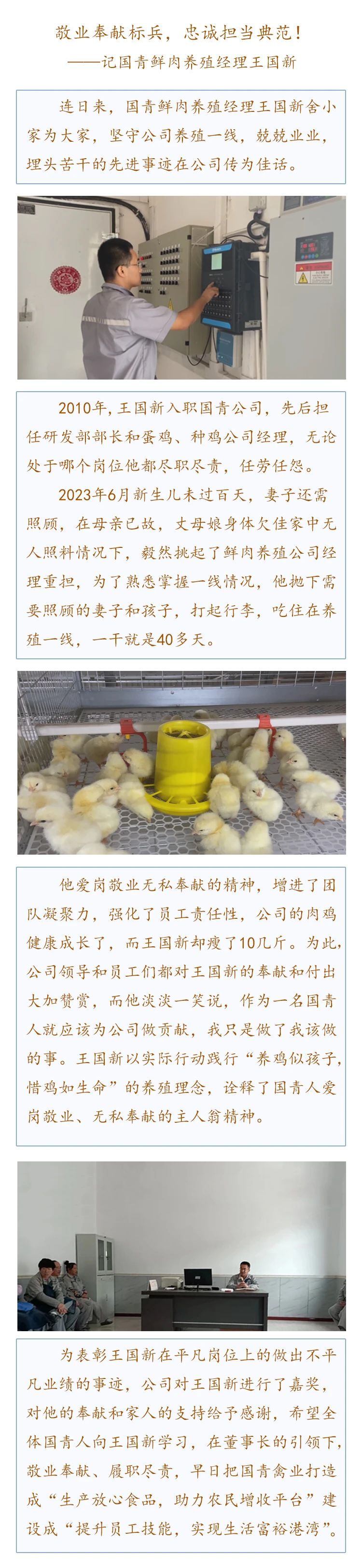 國青禽業是山西省農業產業化重點龍頭企業,起步于1992年,三十年來始終專注家禽養殖,現己成為集種禽飼養、雛雞孵化、飼料生產,蛋、肉雞養殖、屠宰、熟食加工、有機肥生產的循環經濟產業鏈典型企業。公司設六部、六公司,十五個生產廠。截止目前為止,總資產3.5億元,員工500人,擁有“傳康”“潔安佳”“同盈”“澤田園”4大品牌,生產銷售雞苗、飼料、雞蛋、白條雞、熟食、肥料6大系列36種產品。